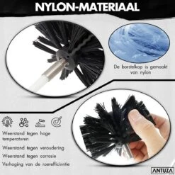 Met een lengte van maar liefst 9 meter en flexibele stelen die elke bocht kunnen weerstaan, kan de borstel gemakkelijk elk vuil losmaken en voorkomt u verstoppingen en brand. De nylon haren van de borstel zijn hard en flexibel, wat betekent dat ze alle vuil en roet kunnen verwijderen zonder beschadiging aan te brengen aan de pijp.