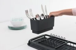 Afgeknapt op je afwas? Het Brabantia Sink Side Afdruiprek Compact – Dark Grey geeft aandacht aan je aanrecht. Dit compacte afdruiprek is de perfecte oplossing als je minder plaats hebt op het aanrecht. Met het uitneembare bestekbakje vul je in een handomdraai je besteklade.