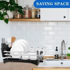 Rekcapaciteit: de bestekhouder biedt plaats aan 9 borden, meerdere kommen en tientallen vorken en messen, aan de zijkant bevinden zich 4 bekerhouders.