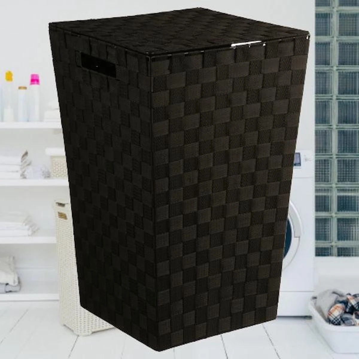 Grote wasmand (60L) van geweven polypropyleen met 1 groot vak voor in jouw badkamer of wasruimte. Polypropyleen onderscheidt zich naast zijn geweldige uitstraling, vooral door zijn onderhoudsvriendelijke, stevige en vochtresistente eigenschappen. Deze wasmand met deksel heeft een groot opbergvak. Zo berg je in deze wasmand eenvoudig al jouw vieze was en kleding op.