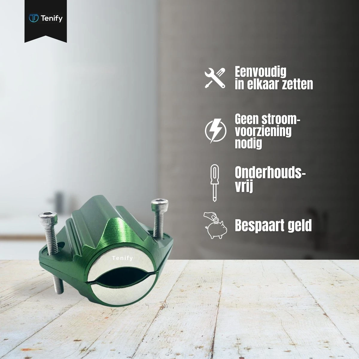 Door middel van onze Tenify magnetische waterontharder voorkom je kalkaanslag op huishoudelijke apparaten. De waterontharder beschermt uw waterleidingen, wasmachine, droger, sanitair en keukenapparatuur tegen kalkaanslag. De krachtige NdFeB antikalk magnetische componenten creëren een krachtig magnetisch veld van 7800 Gauss (0,78 tesla) in de waterleidingen, zodat mineralen, calcium en magnesium niet meer kunnen kristalliseren tot calciumcarbonaat (kalkaanslag). Met het eindresultaat dat de bestaande kalkaanslag geleidelijk wordt afgebroken in de waterleidingen en kalk drastisch vermindert tot wel 90%.