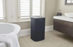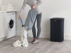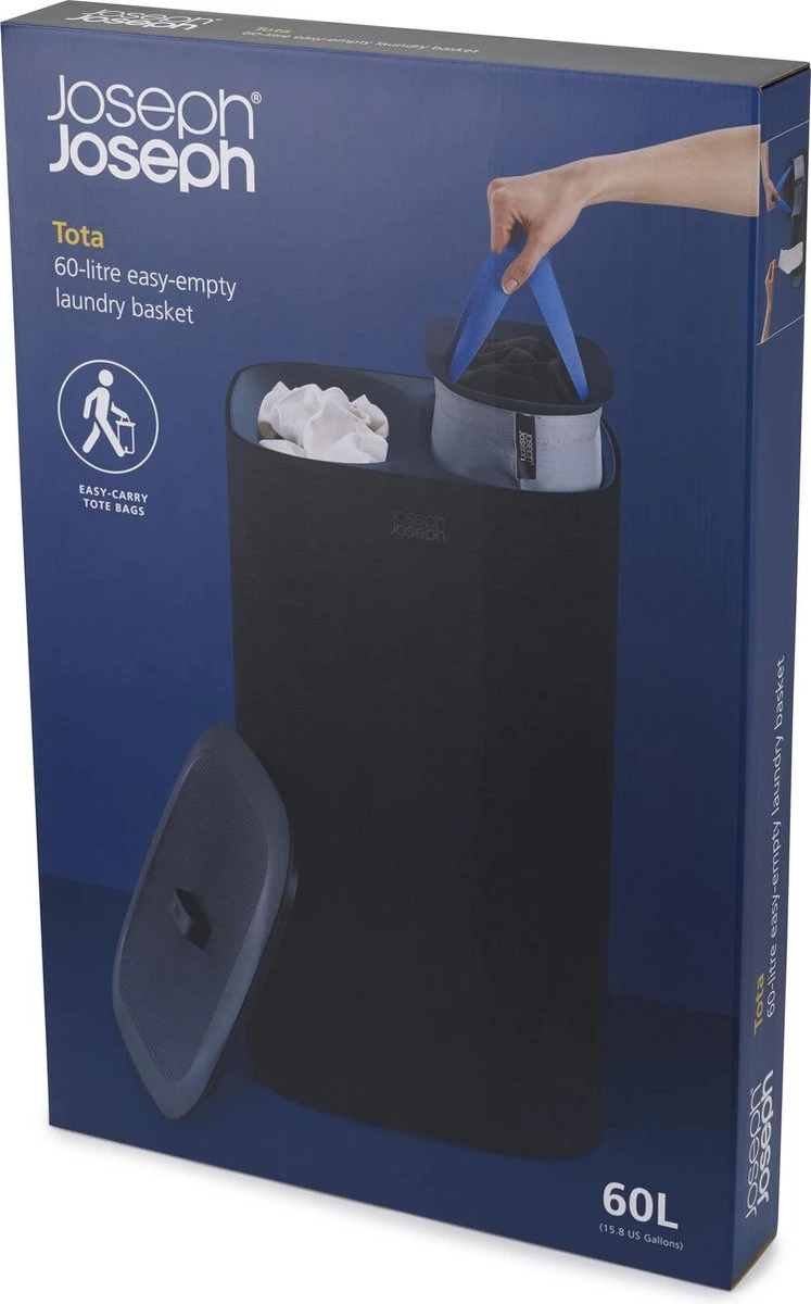 Het sorteren van wasgoed is nog nooit zo makkelijk geweest met deze slimme Tota wasmand van Joseph Joseph. Dankzij de praktische snufjes is de wasdag voortaan een minder grote klus. De wasmand is voorzien van een deksel waaronder je 2 verschillende stoffen tassen vind welke gebruikt kunnen worden om licht en donker wasgoed te kunnen scheiden. Iedere tas is voorzien van handvatten waardoor je hem makkelijk vanuit de wasmand naar de wasmachine kunt tillen. De lus aan de onderzijde helpt je vervolgens om de tas makkelijk te legen. Hierna kan de tas eenvoudig, zonder lussen of knopen, in de wasmand worden teruggeplaatst dankzij de zelf lokaliserende rand zodat hij perfect op zijn plaats valt. Het stijlvolle ontwerp maakt deze wasmand ideaal om te combineren met andere stijlen in huis waardoor hij niet misstaat in zowel de badkamer, slaapkamer of het washok. Deze wasmand heeft een inhoud van 60 Liter en is ook verkrijgbaar in een 90 Liter variant. Hij wordt plat geleverd inclusief montage instructies.