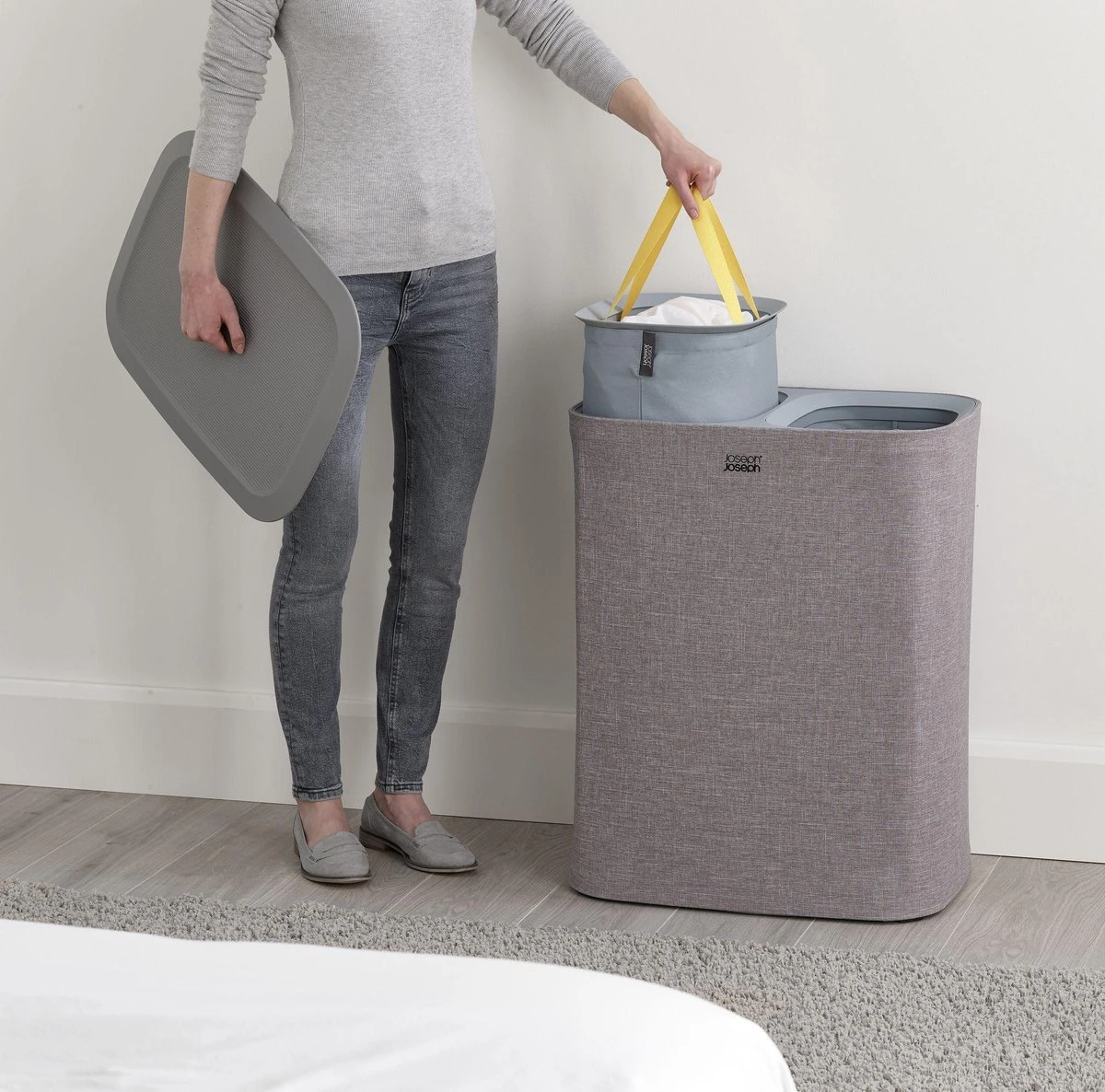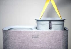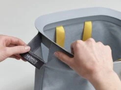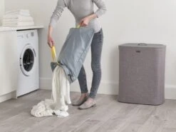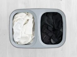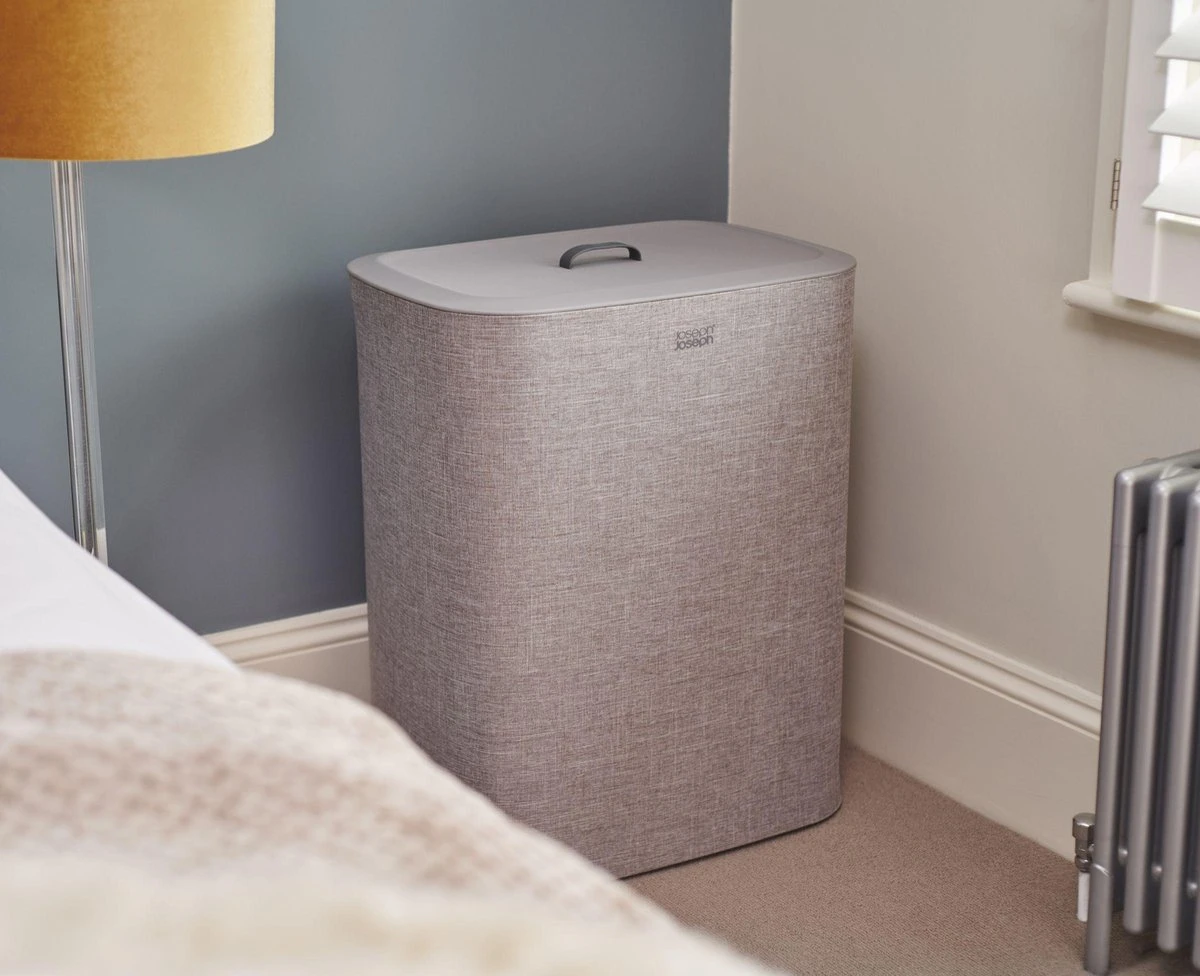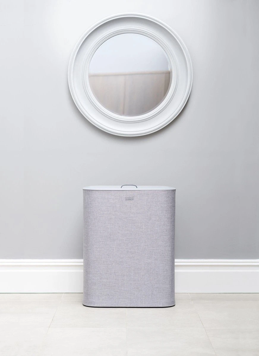 Het sorteren van wasgoed is nog nooit zo makkelijk geweest met deze slimme Tota wasmand van Joseph Joseph. Dankzij de praktische snufjes is de wasdag voortaan een minder grote klus. De wasmand is voorzien van een deksel waaronder je 2 verschillende stoffen tassen vind welke gebruikt kunnen worden om licht en donker wasgoed te kunnen scheiden. Iedere tas is voorzien van handvatten waardoor je hem makkelijk vanuit de wasmand naar de wasmachine kunt tillen. De lus aan de onderzijde helpt je vervolgens om de tas makkelijk te legen. Hierna kan de tas eenvoudig, zonder lussen of knopen, in de wasmand worden teruggeplaatst dankzij de zelf lokaliserende rand zodat hij perfect op zijn plaats valt. Het stijlvolle ontwerp maakt deze wasmand ideaal om te combineren met andere stijlen in huis waardoor hij niet misstaat in zowel de badkamer, slaapkamer of het washok. Deze wasmand heeft een inhoud van 90 Liter en is ook verkrijgbaar in een 60 Liter variant. Hij wordt plat geleverd inclusief montage instructies.
